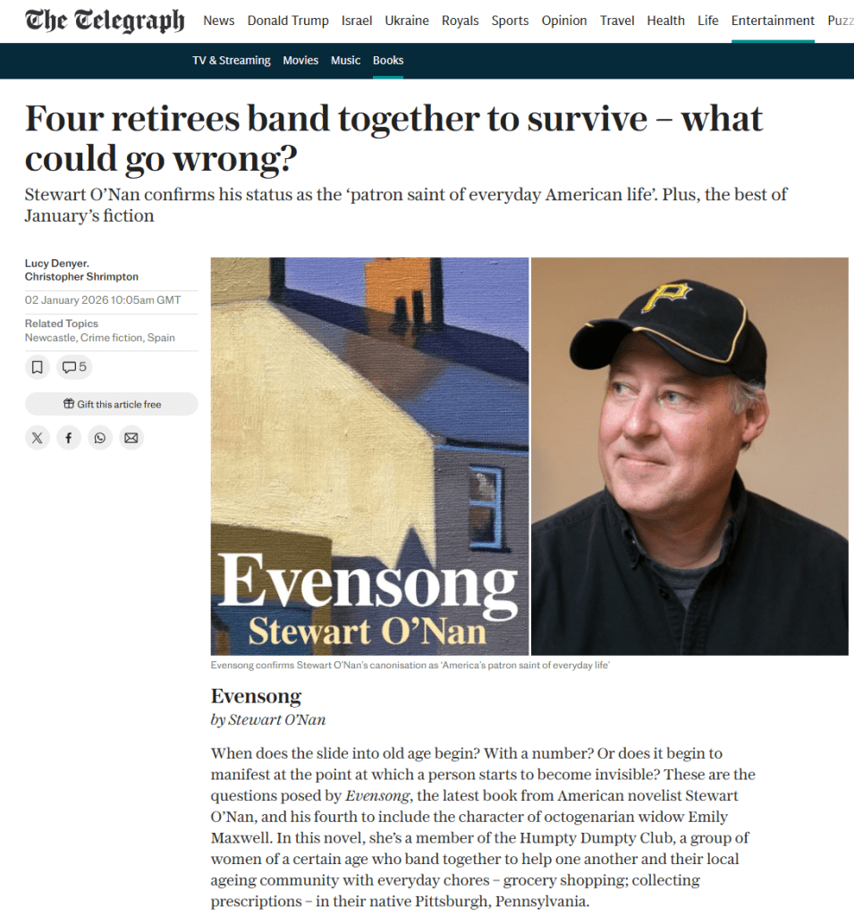 When does the slide into old age begin? With a number? Or does it begin to manifest at the point at which a person starts to become invisible? These are the questions posed by Evensong, the latest book from American novelist Stewart O’Nan, and his fourth to include the character of octogenarian widow Emily Maxwell. In this novel, she’s a member of the Humpty Dumpty Club, a group of women of a certain age who band together to help one another and their local ageing community with everyday chores – grocery shopping; collecting prescriptions – in their native Pittsburgh, Pennsylvania.